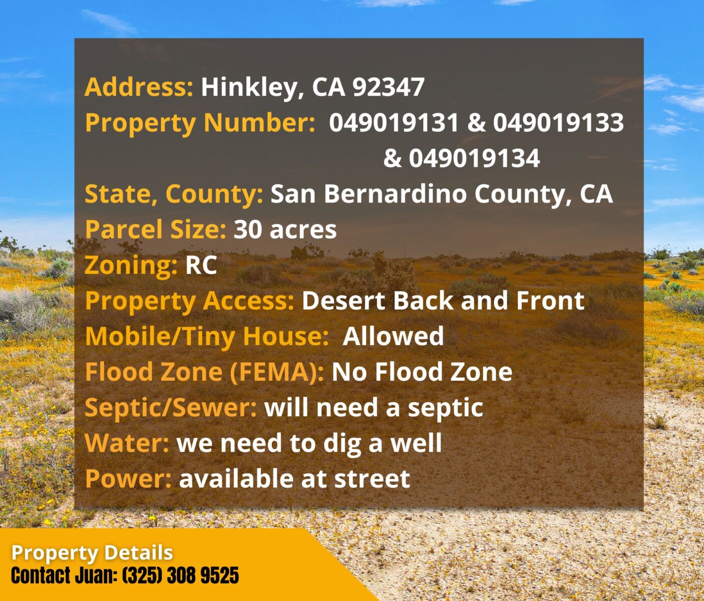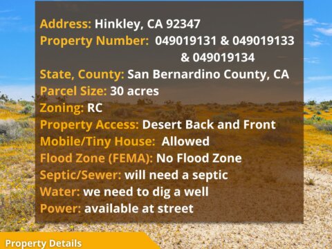 Experience the quiet beauty of the Mojave with this 30-acre retreat in Hinkley, CA—three adjacent parcels offering room to breathe, wide-open skies, and the freedom to create your own rural escape or ranch-lite lifestyle.